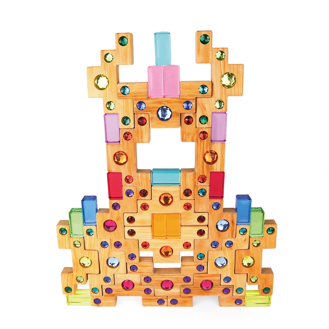 Die Farbtreppen mit jeweils fünf eingearbeiteten Funkelsteinen lassen sich perfekt mit den beliebten Lichtbauquadern kombinieren. Dank der bewusst abgestimmten Maße entstehen im Spiel farbenfrohe Fenster, leuchtende Türme und fantasievolle Bauwerke.
