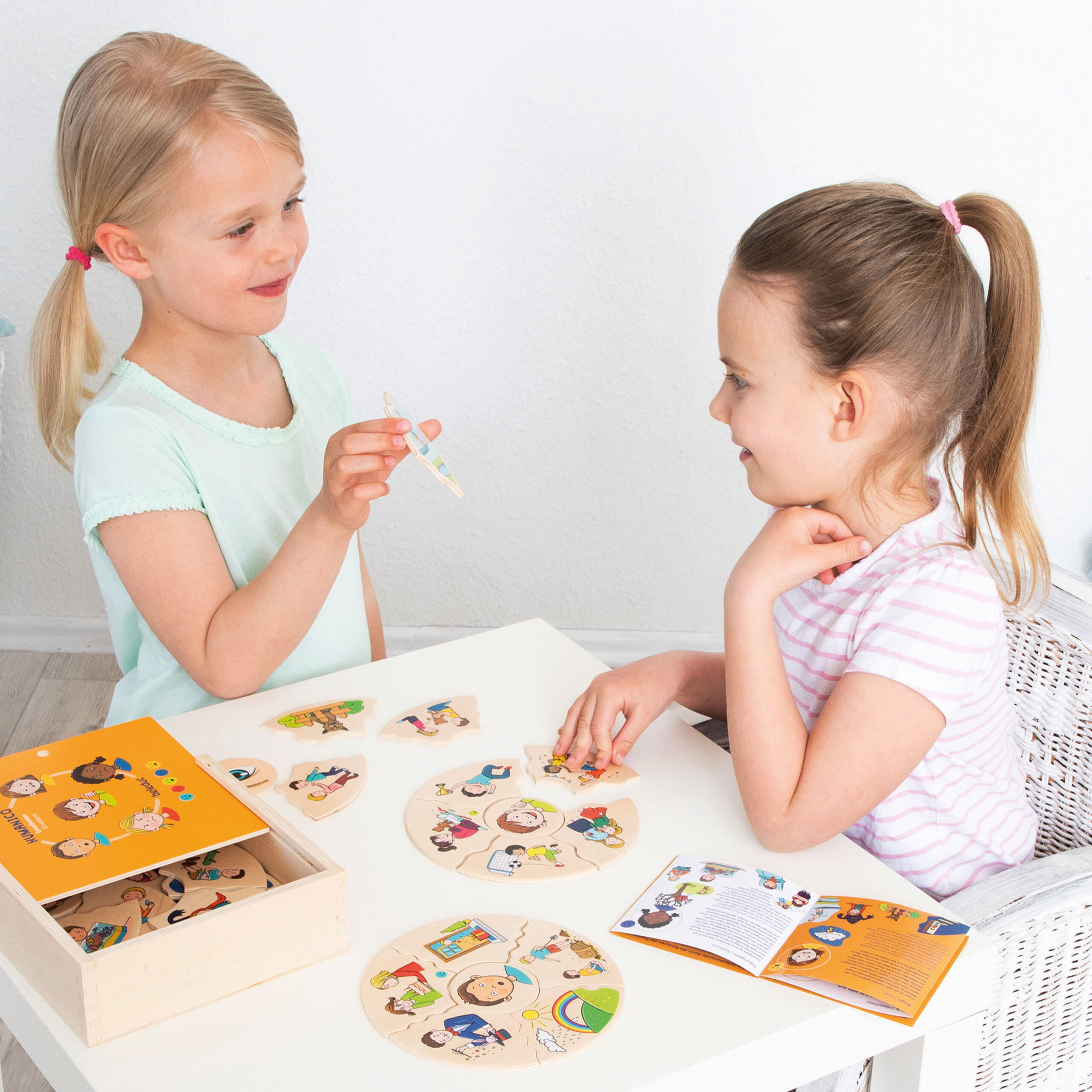 Lernspiele inkl. Holzkiste zum Aufbewahren und Begleitheft mit kindgerechten Erklärungen zu dem jeweiligen Thema.