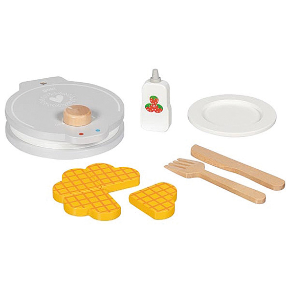 Inhalt: Holz-Waffeleisen, 4-teilige Waffel, Sirup, Teller, Gabel & Messer.